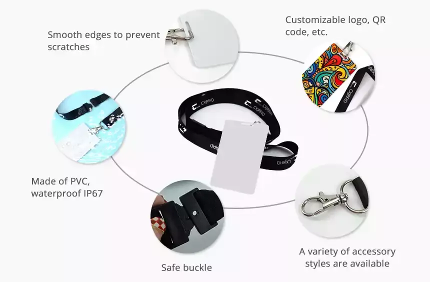 The customized NFC lanyard is made of PVC and Nylon (or ployester, customized), is waterproof and durable. The size, printing, material of CXJ's NFC lanyards are customized, welcome to contact us to customize your own brand NFC lanyard and nfc id card. We also offer other customization options, such as NFC wristbands and NFC pet tags.