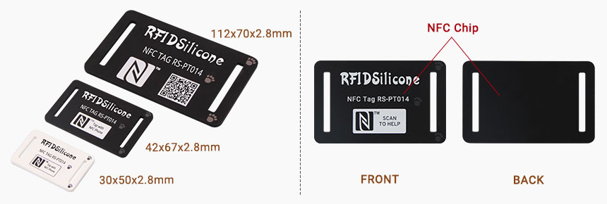 2. The NFC silicone pet tag RS-PT014 contains the NTAG213 chip from leading chip manufacturer NXP. All the necessary information of your dog can be easily stored on the chip via the App or website platform. You can update the information at any time if necessary. The NFC chip is invisible and integrated into the product and is not affected by external influences. Due to the material used, the NFC pet tag RS-PT014 is a very flexible dog tag that neither water nor dirt can penetrate. The NFC chip can be read by any NFC-enabled smartphone, and a smartphone that does not support NFC can use the QR code printed on it.