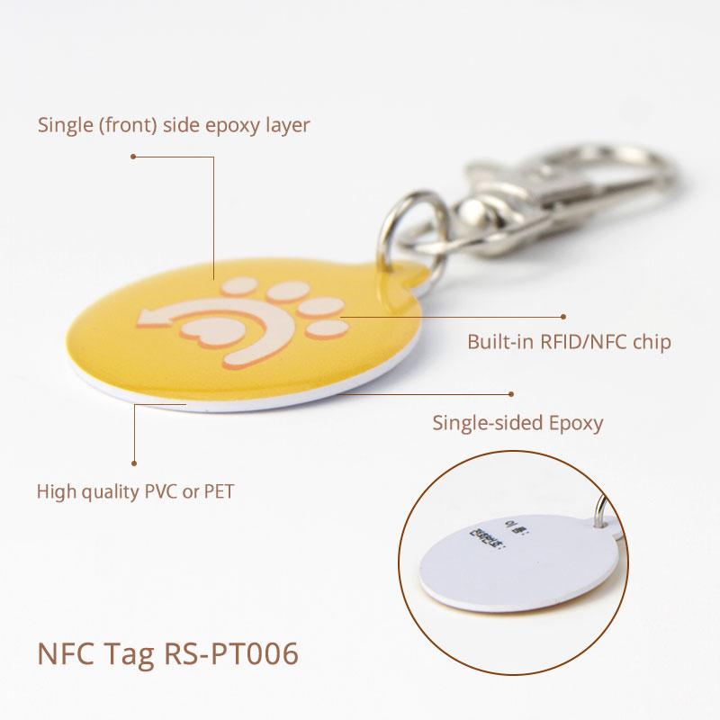 Smart epoxy NFC dog tag RS-PT006 adopts single-sided glue-dipping process, and the thickness is as thin as 2.2mm. It has built-in NFC chips such as NTAG213/215/216. NFC pet tag will be written into the URL that stores the pet file and owner information submitted by the customer's website user registration.