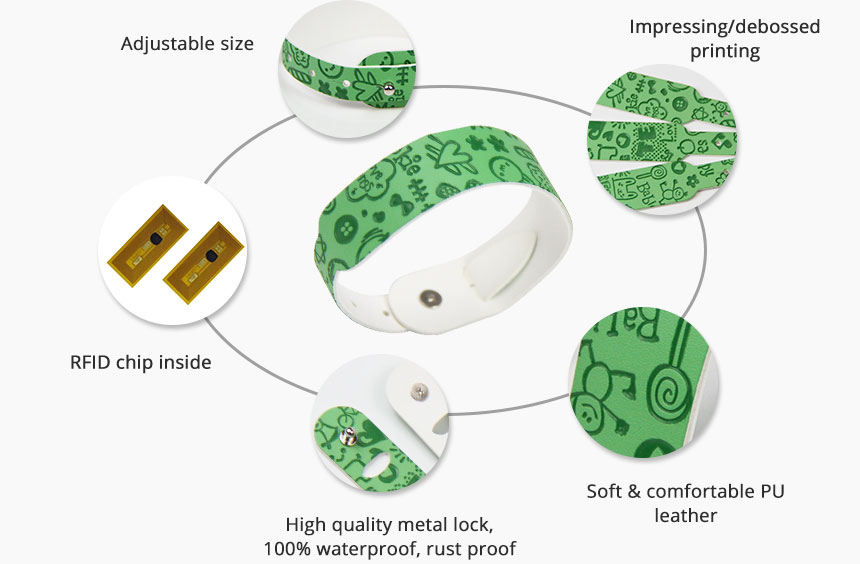 RFID PU leather wristbands are ideal for use in public transportation, event ticketing, loyalty system, etc.